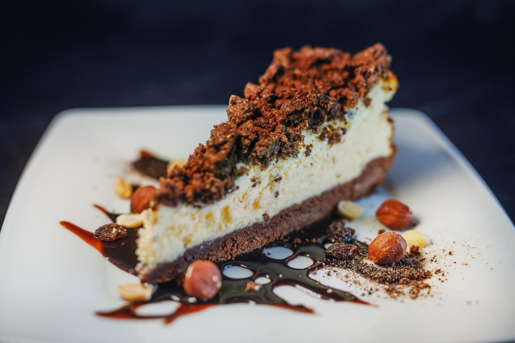 klasyczny sernik królewski podany z sosem czekoladowym i bakaliami