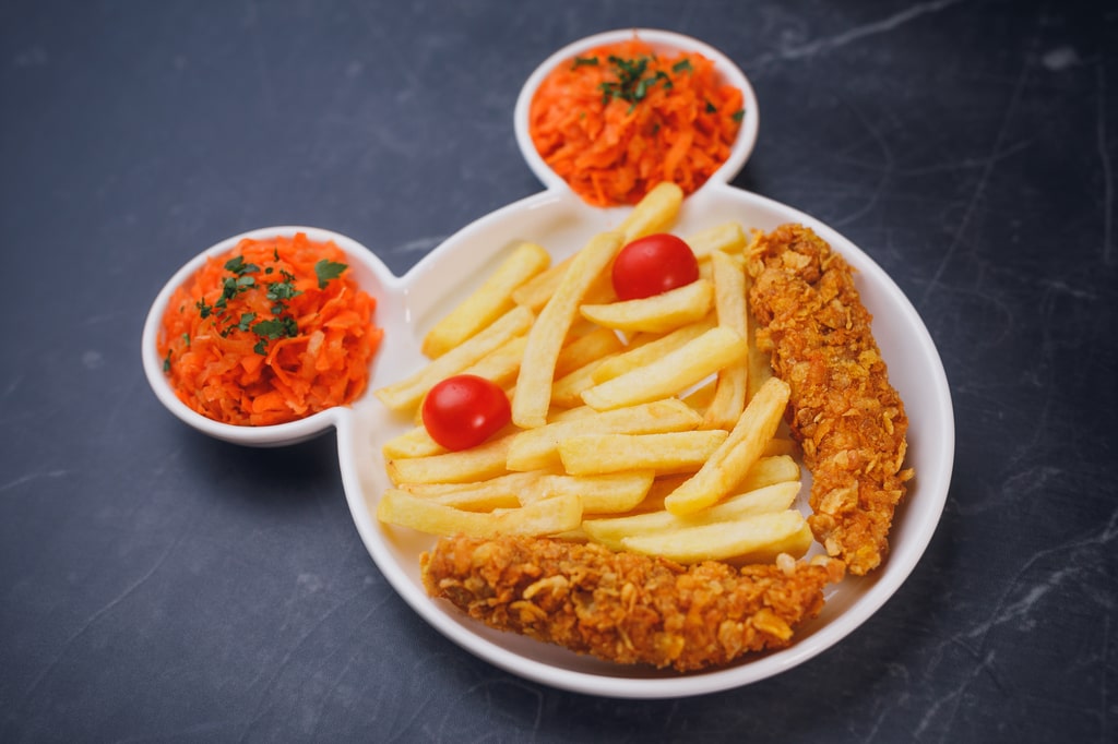Fileciki z kurczaka z frytkami i surówką z marchewki i jabłka