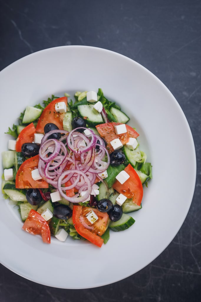 plastry bakłażanu, papryki, buraka, czarne oliwki, rukola, pomidorki koktajlowe, tofu, podane z sosem jogurtowo - sojowym, przyprószone ziarnami sezamu